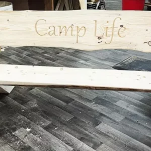 Timber Frame and Slab Wood Bench with Live Edge Features. This sturdy yet elegant bench combines the natural beauty of raw wood with durability and functionality. The 5×5 timber frame design adds strength and support to the seat, backrest, and armrests, making it an ideal spot to relax outdoors. Each bench features unique live edge details, showcasing the natural texture and grain patterns of the wood, adding character and charm to your patio or garden setting. The weather resistant finish protects against sun damage, water, and UV rays, ensuring long-lasting use in outdoor environments. Available in multiple lengths can be engraved with custom design on backrest.